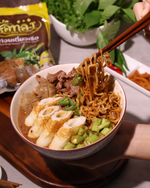 Each pack features springy Japanese-style wheat noodles that absorb the rich, aromatic soup base — an enhanced vegetarian-friendly recipe infused with Thai herbs, bold spices, and just the right level of heat. Every bite brings you straight to the heart of a traditional Thai boat noodle stall.