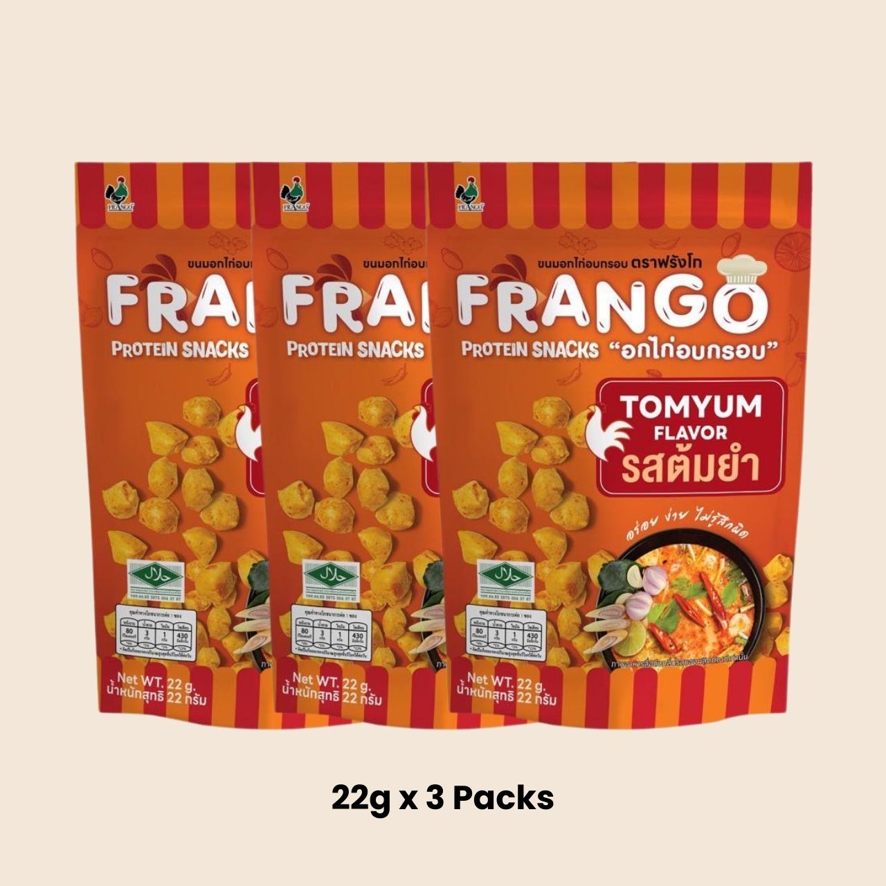 Ingredients: Tom Yum: Chicken Breast (91.7%), Tom Yum Seasoning Powder (5.3%), Wheat Starch (1.8%), Tapioca Starch (1.0%), Iodized Salt (0.22%) & Sacrulose (0.001%)